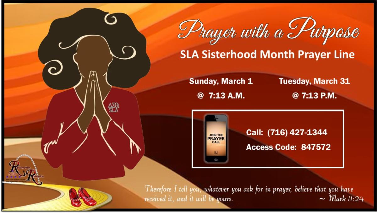 SLA Sisterhood Month Prayer Line @ 7:13 PM Call: (716) 427-1344, Access code: 847572 |